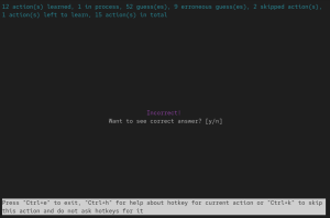 basic.py— базовая логика хранения горячих клавиш и результатов обучения, а также самого процесса обучения;filestorage.py— реализация абстрактных классов хранения горячих клавиш и результатов обучения, где хранилищем является YAML файл;cursestui.py— реализация ncurses консольного интерфейса пользователя (файлыsimpletext.pyиcursestext.pyсодержат два других режима интерфейса, но больше не поддерживаются).