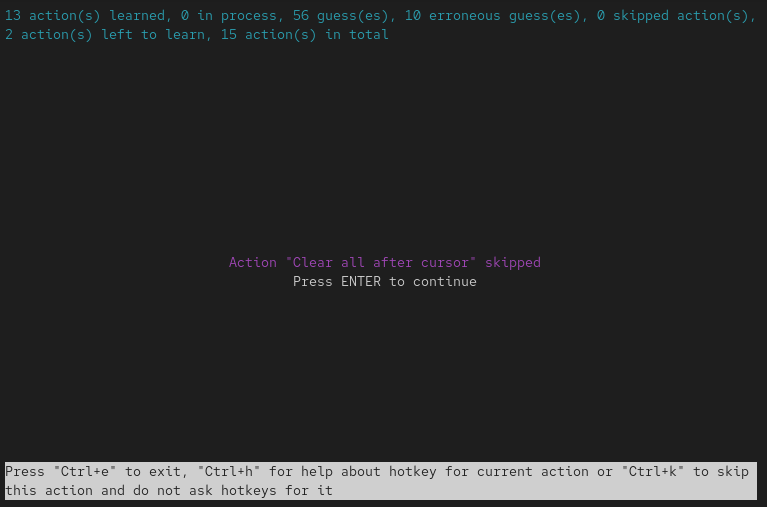 Или, если вы нашли действие, которое не хотите запоминать, нажмите Ctrl+k, чтобы пропустить его, и вы увидите сообщение: